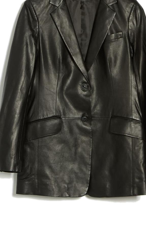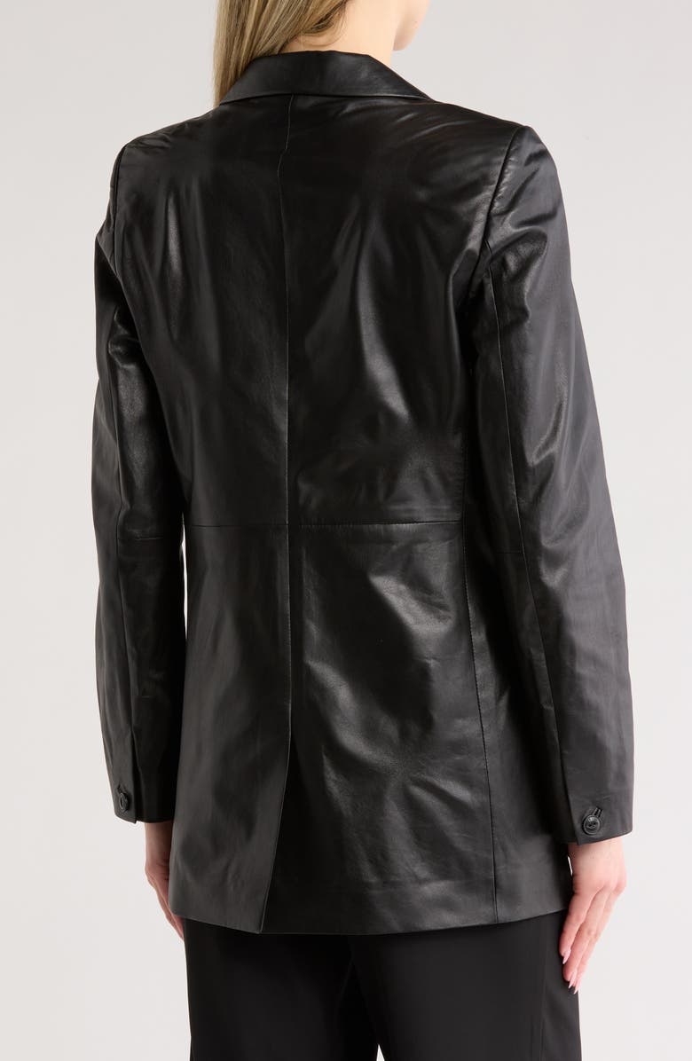 Buttery-soft lamb leather gives an air of elegance to this classic blazer that's cut in a longline silhouette to make a dramatic layering piece.