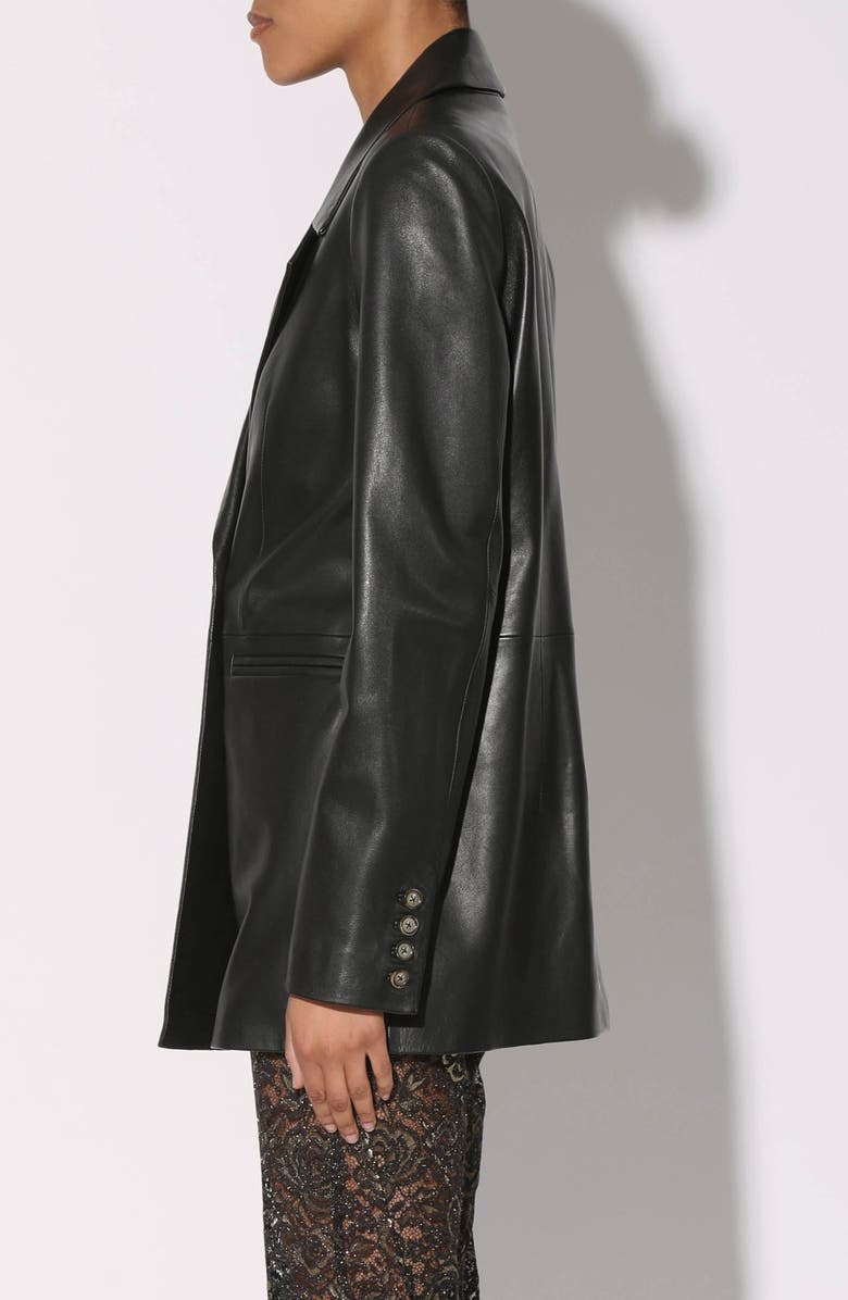 Classic double-breasted styling elevates a longline blazer crafted from supple leather.