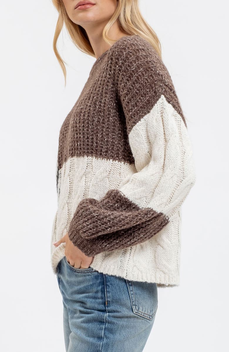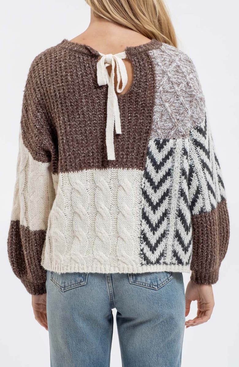 A colorblock design with bold chevrons bring contemporary appeal to a cozy balloon-sleeve sweater that's perfect for chilly days.