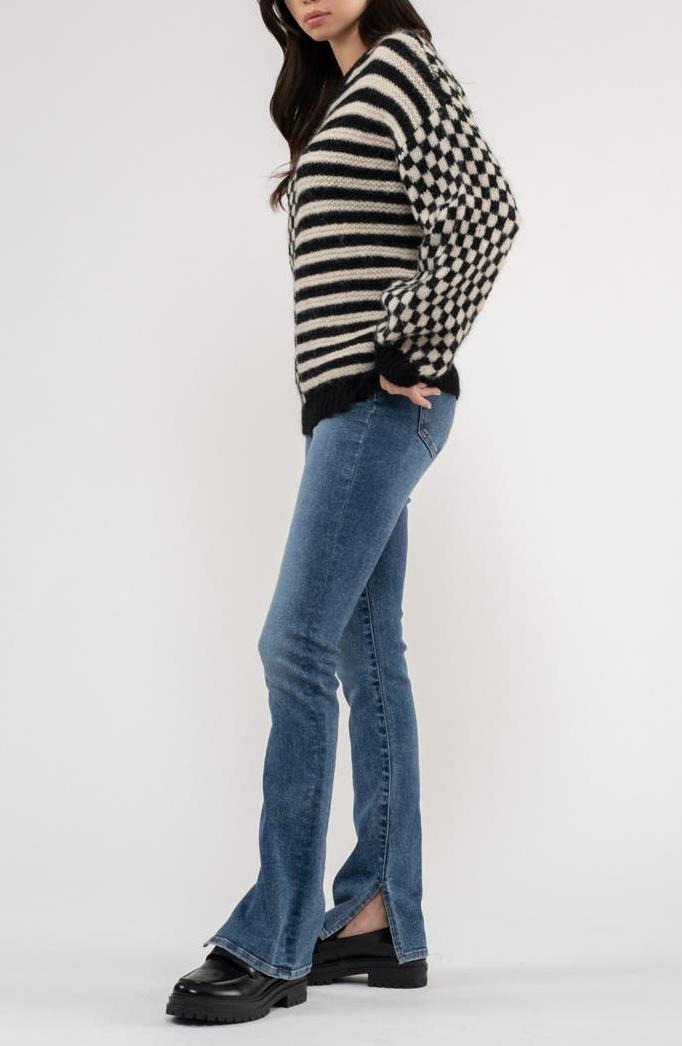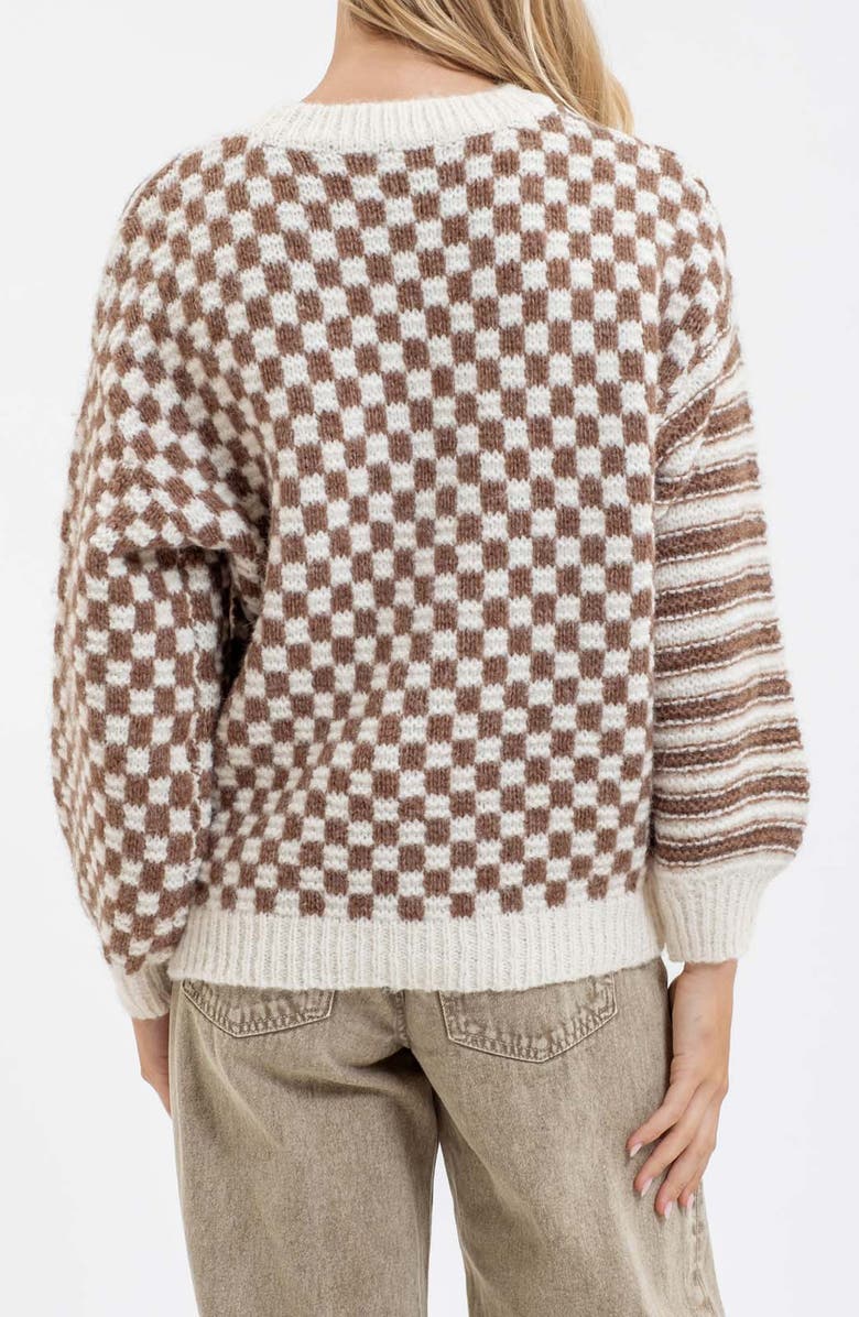 Checkered and striped panels bring contemporary style to a soft pullover sweater knit in a slouchy cropped silhouette.