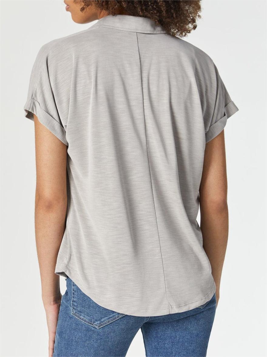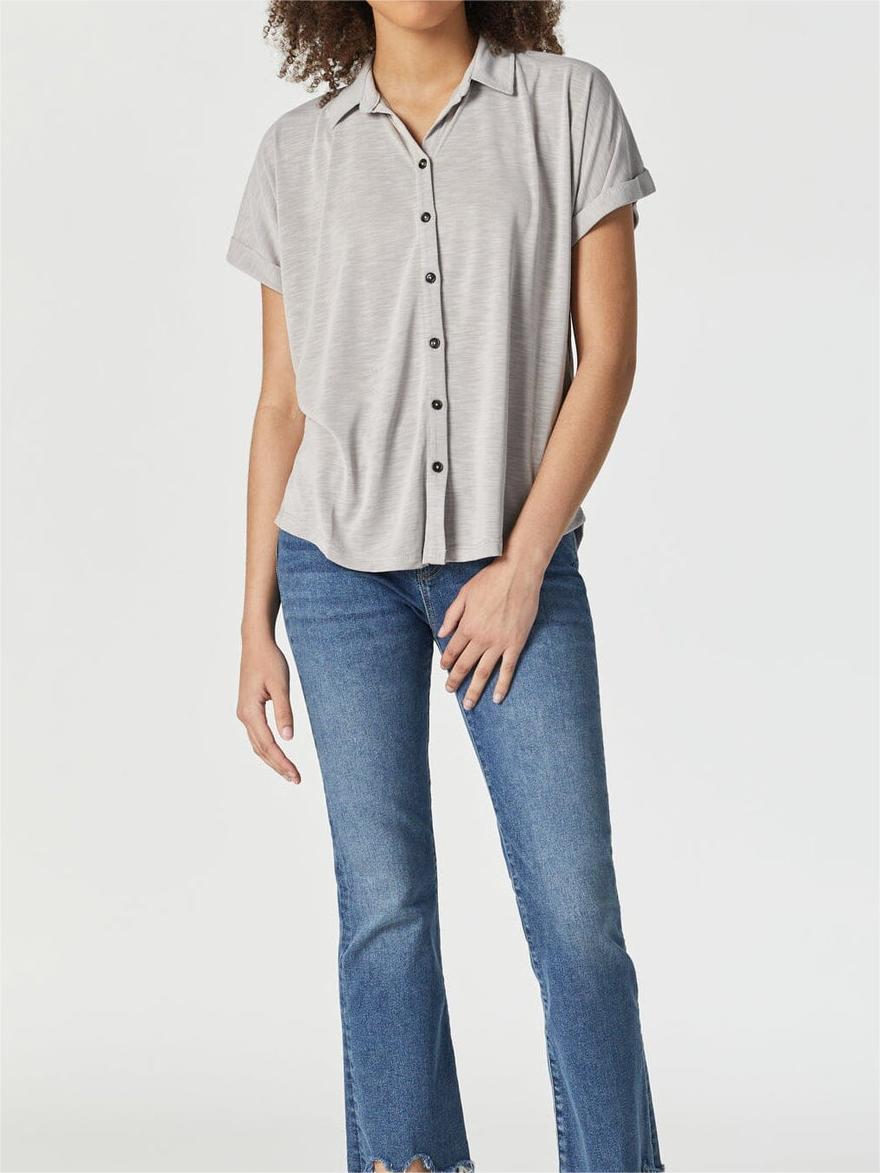 This button-up shirt is a closet staple featuring a relaxed fit and black buttons. Its design makes it easy to dress up or down and is versatile for any occasion.